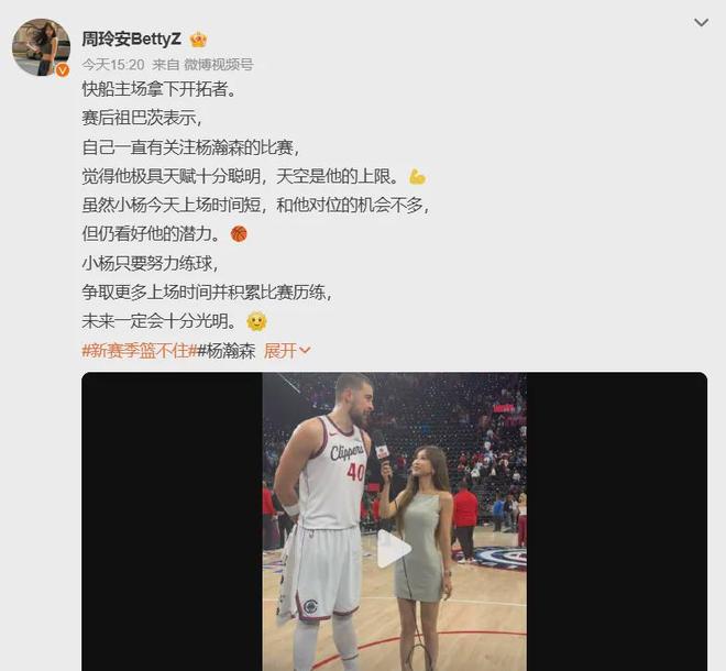赛后,此役砸出21分8板3助2帽全面数据的快船首发核心中锋祖巴茨,对与自己有着短暂对位的杨瀚森进行了点评,表示:“我一直在看他的一些比赛,非常有天赋,只需努力训练,但非常遗憾本场没怎么看到其的发挥。”