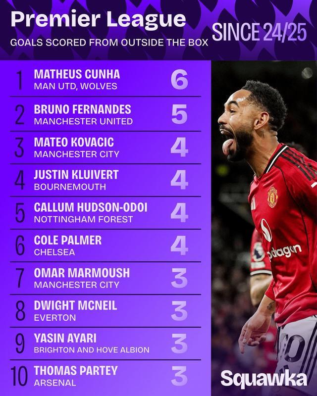 2024/25赛季以来禁区外进球最多球员榜单