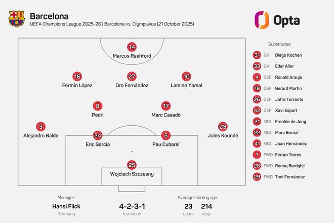 巴萨首发:25-什琴斯尼、3-阿莱士-巴尔德、5-库巴西、24-埃里克-加西亚、23-孔德、17-卡萨多、8-佩德里、10-亚马尔、27-德罗-费尔南德斯、16-费尔明、14-拉什福德